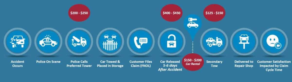 In the typical non-drivable accident, the police will secure a municipal tow to move the damaged vehicle from the accident scene to a storage lot. Days later, the consumer will notify the insurance carrier of the loss and then the insurance carrier will work to determine where the vehicle is stored and coordinate the movement of the vehicle from the storage lot to the repair shop. When you add up the cost of the primary tow, the storage lot fees, the secondary tow, the processing of all the paperwork, and the five days of alternate transportation for the consumer, the insurance carrier has spent almost $1,000 and five days of cycle time before the repair shop can even begin its work. When you add up all these costs across all the non-drivable events you find that insurance carriers in the U.S. are effectively wasting over $3 Billion, which inevitably gets passed on to consumers in higher premium costs. There is a better way!