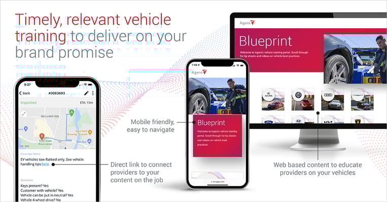 Blueprint, our in-depth self-service library, equips all service providers with vehicle-specific training, tips and tricks. With Swoop, links to vehicle-specific Blueprint content are automatically sent to the service provider at the time of dispatch. This ensures optimal care of vehicles during service events and aids in getting the job completed safely and as quickly and efficiently as possible. With new EV models launching and EV adoption increasing, vehicle-specific content is especially important as the differences associated with EVs can be confusing and challenging for providers. Usage data helps us tailor the right training cadence and materials for specific technicians, dealerships, or markets.