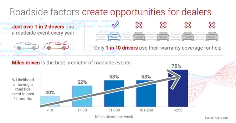 Just over one in two drivers (and even more for battery electric vehicles) will experience a roadside event each year – from a flat tire, a dead battery, a lockout, or no fuel to a range of mechanical issues that require a tow. Roadside events can negatively impact brand satisfaction, but surprisingly having an event and using roadside coverage actually creates higher brand satisfaction. Drivers that used their auto roadside assistance are 35% more likely to buy the same vehicle brand.1 The factors that can predict an event are drivetrain, miles driven, and vehicle age. Like most things people do infrequently, the details of the roadside assistance process are often forgotten. When a roadside event occurs, many drivers don’t use the app or phone number provided by the manufacturer for assistance. Instead, they will contact their dealer directly for help and this creates a new and valuable customer touchpoint.